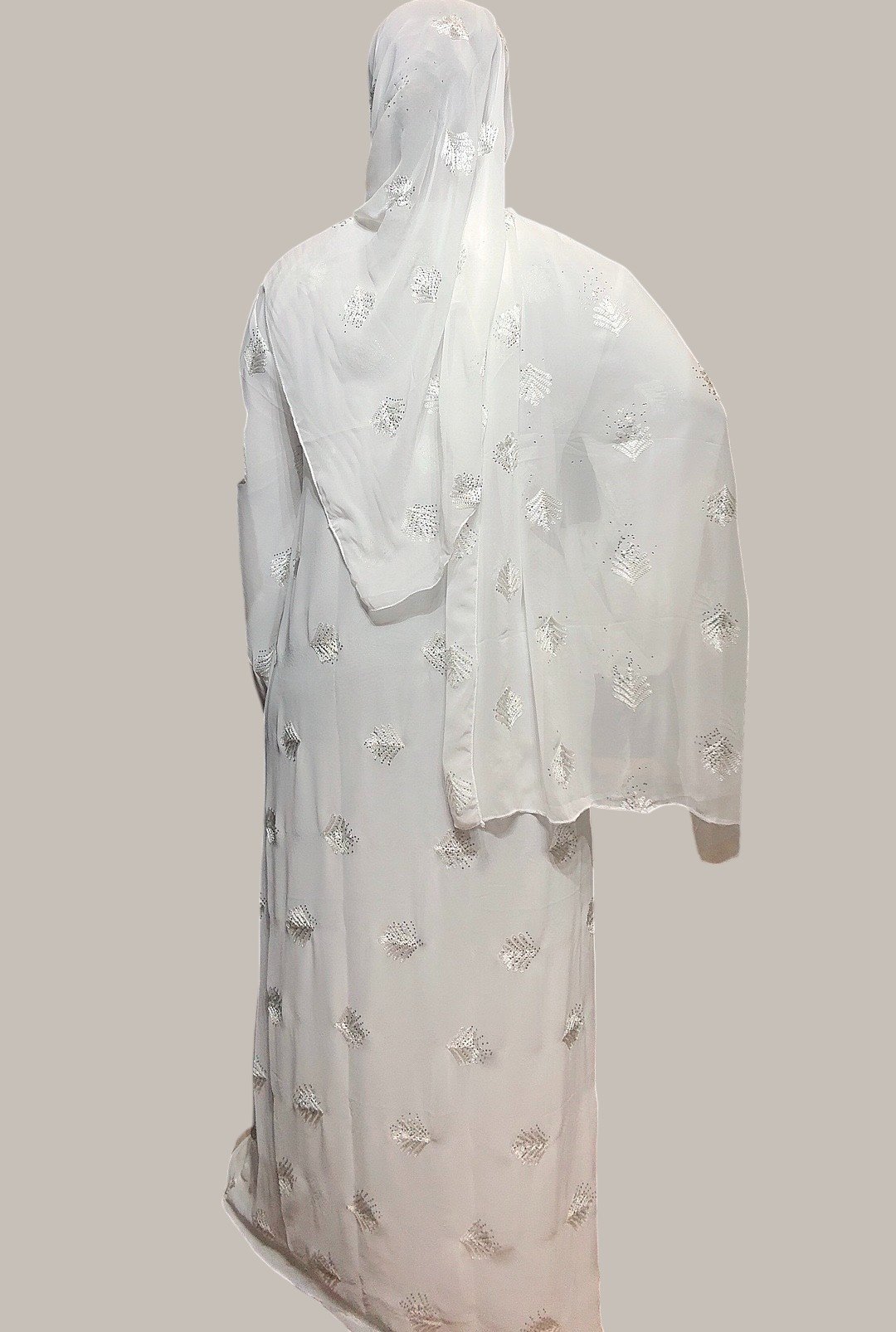 The double chiffon abaya is a two-piece closed abaya. It is made from lightweight and flowy chiffon fabric. The abaya features a unique design with small, textured embellishments scattered across the fabric, adding a touch of elegance and sophistication. The abaya is available in a range of colors, including a rich burgundy, muted blue-grey, green, white, nude and dusty tea offering options for different preferences and events. The overall look is modest yet fashionable, combining traditional elements with contemporary design details.